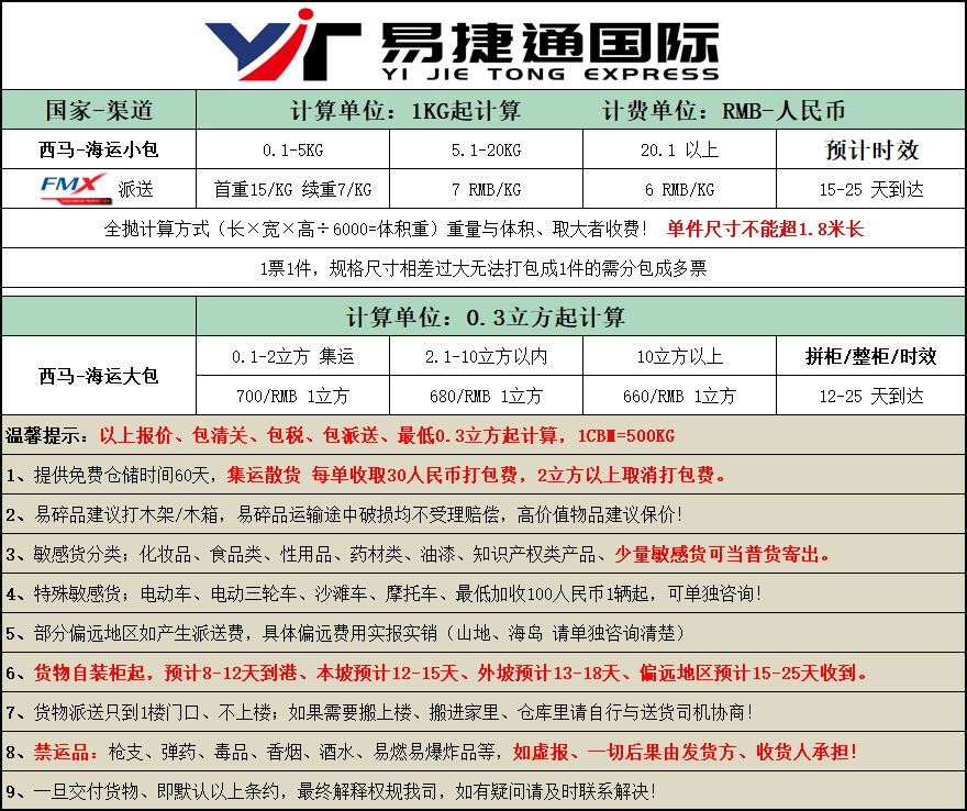 1、以上报价仅供参考,实际计费以装箱打包后的实重或轻泡体积重来计算。